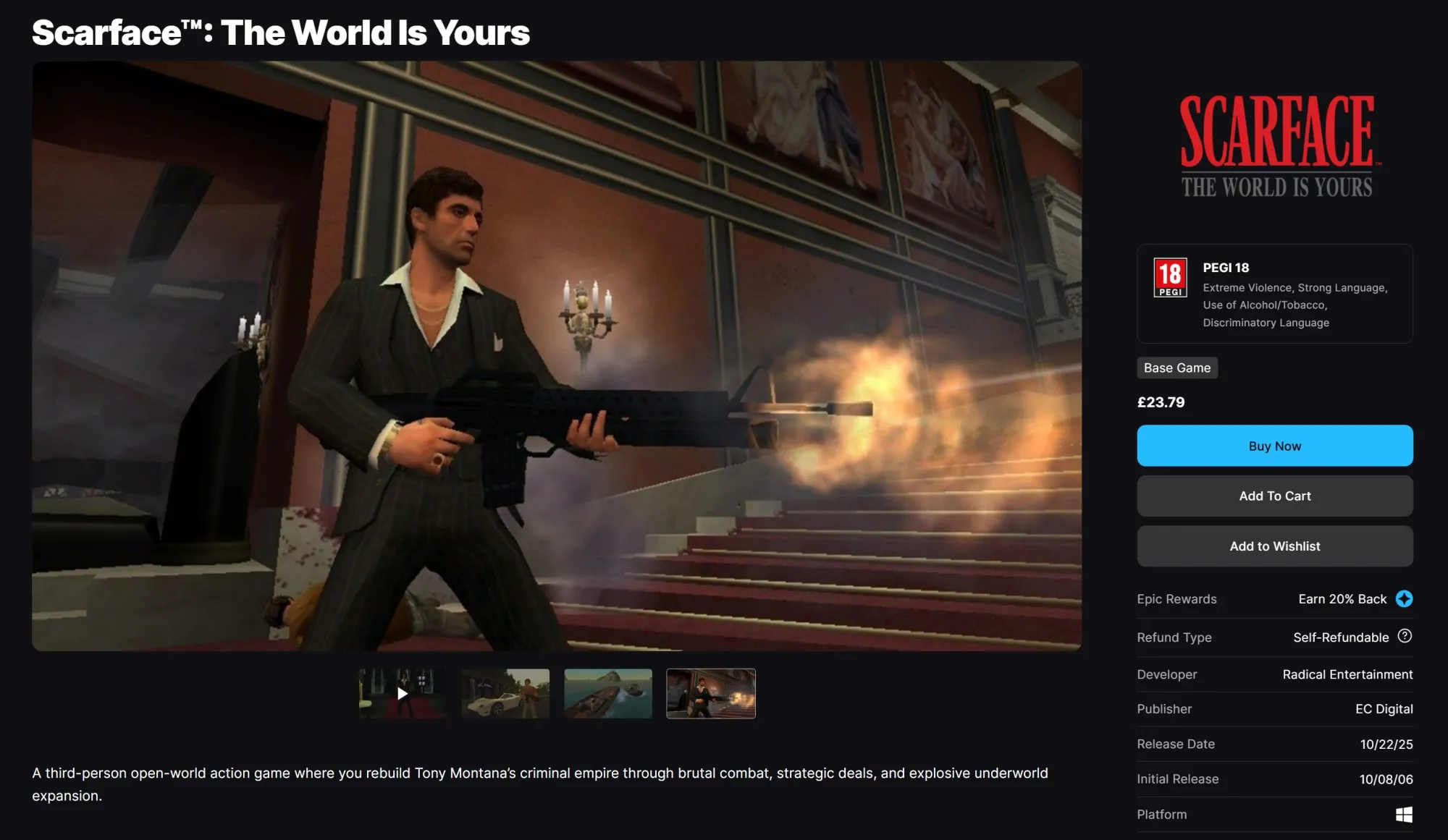 - Et puisqu’on parle de remake/remaster foireux, touchons un mot sur le retour du Scarface: The World Is Yours de 2006. Un remaster est apparu chez Epic avant d’être immédiatement délisté, mais les petits malins l’ayant téléchargé ont réalisé qu’il contenait… un mod amateur, pour lequel le développeur n’avait pas été contacté. La fiche produit indique que certains éléments visuels ont été améliorés par IA, avec la possibilité de garder le rendu original. Face aux critiques, l’éditeur EC Digital Entertainment a publié un message expliquant que le titre avait été mis en ligne trop vite… avant de supprimer le communiqué et le jeu. Il y confiait ne pas avoir encore finalisé la question des droits, ce qui, pour une licence comme Scarface, est quand même plutôt audacieux. Pas sûr qu’on le revoit de si tôt.