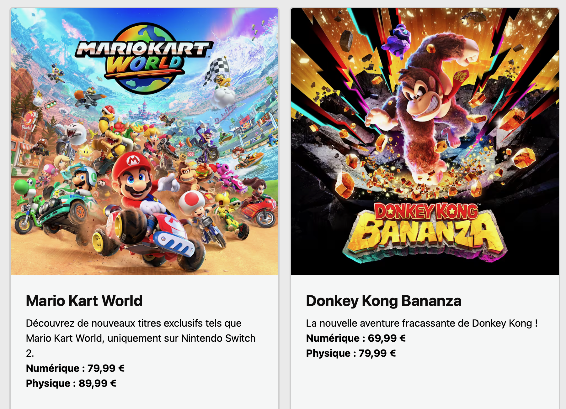 Fini le temps où Nintendo faisait figure d’exception côté prix : les jeux Switch 2 suivront, eux aussi, la tendance à la hausse. Mario Kart World par exemple, porte-étendard de la console, sera vendu 80 € en démat’ et 90 € (!) en version boîte. Le prochain Donkey Kong sera lui facturé 70 € sur l’eShop et 80 € en physique. Ouch.