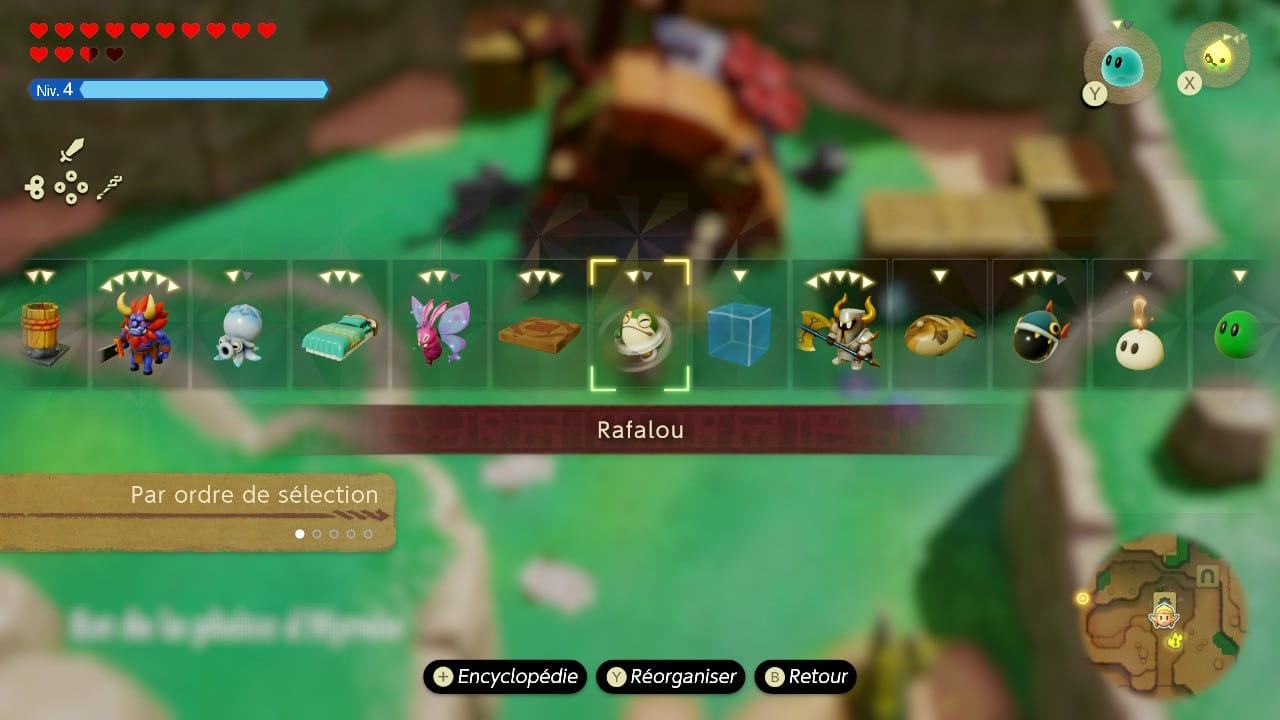… Echoes of Wisdom n'est pas un sans-faute malheureusement. Le principe des échos secoue la formule des Zelda et ça c'est très bien. Encore faut-il pouvoir les utiliser : Nintendo n'a rien trouvé de mieux que d'aligner les échos les uns derrière les autres dans une ligne qui devient rapidement très longue. Il y a bien quelques options de tri (par ordre de mémorisation, par coût, par type…), mais il n'y a pas de favoris ni de critères personnalisés.