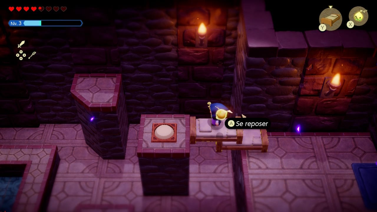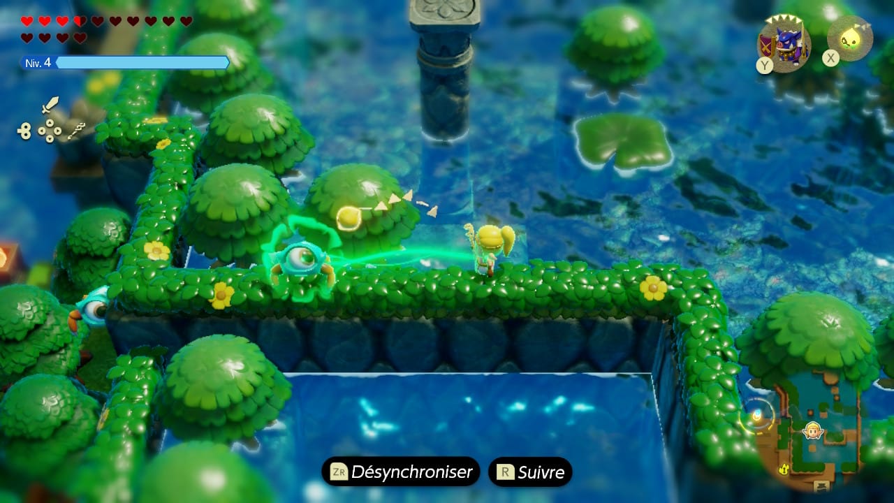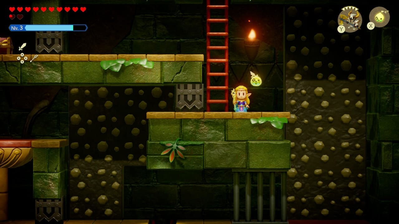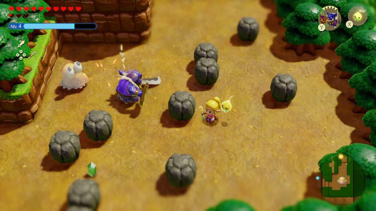 L'épéiste ne reste pas très longtemps : une jauge limite en effet le temps disponible avec l'écho. Dans un sens, c'est tant mieux : après tout, on n'est pas là pour jouer avec Link, mais avec Zelda ! De plus, en dehors des boss, les moments où Link est absolument indispensable ne sont guère nombreux.
