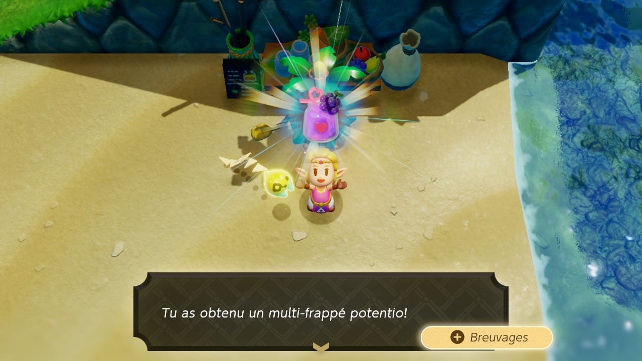 Et c'est sans compter son autre usage : Zelda peut s'y reposer en tout temps pour récupérer des cœurs (y compris pendant les combats de boss entre deux phases !). Voilà qui nous amène directement à un autre problème de gameplay : le système de frappés. Ici et là dans Hyrule, des marchands proposent de créer des frappés en mélangeant deux ingrédients. Des dizaines de recettes peuvent être trouvées de la sorte, qui permettent à la princesse de regagner des cœurs, de l'énergie pour l'épéiste, et d'autres capacités (nager plus longtemps, etc.).