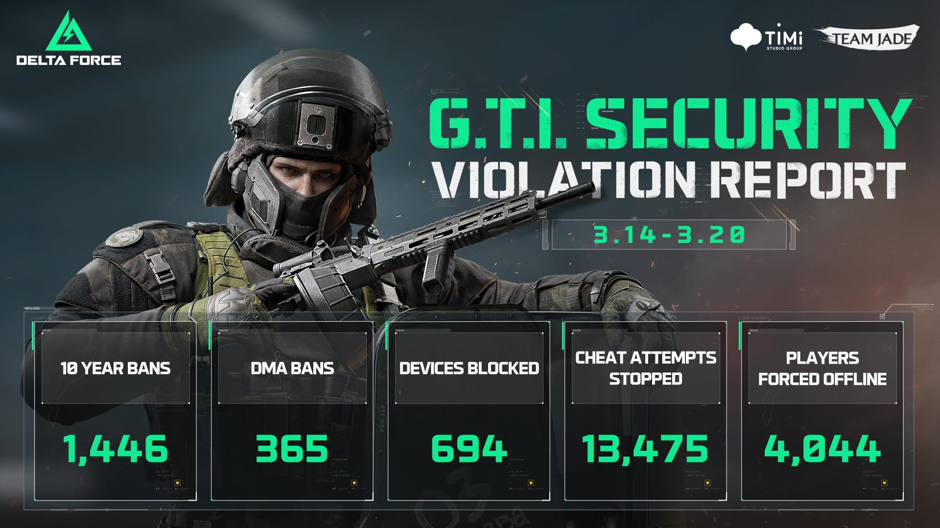 694 appareils ont été bloqués, plus de 13 000 tentatives de triche ont été arrêtées, et plus de 4 000 joueurs ont été rejetés du multi en ligne. En janvier dernier, à la fin de la saison « Genesis », Delta Force avait infligé des bans de 10 ans à 7 305 malandrins !