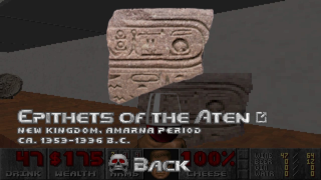 Et bien sûr, il y a les œuvres d'art, numérisés pour l'occasion, et que l'on peut afficher en grand sur l'écran. Il y a même des liens vers le Met de New York pour en savoir plus — oui, Doom peut être un outil éducatif. Le jeu est un mod du tout premier niveau de Doom, à télécharger sur Windows. C'est gratuit, mais rien ne vous empêche de laisser un petit quelque chose en partant.