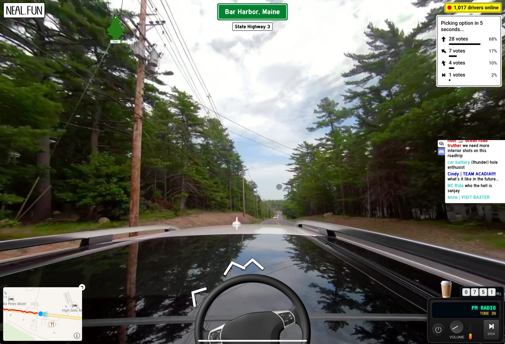 - Des petits malins se sont inspirés du succès de Twitch Play Pokémon pour lancer « Internet Roadtrip », qui, comme son nom l’indique, consiste à arpenter Google Maps derrière un volant en compagnie d’autres internautes anonymes. Chaque personne peut voter pour une direction toutes les 5 secondes, et il est même possible de klaxonner ou de changer la station de radio. La voiture partie de Boston est actuellement paumée dans le Maine, ce qui fait quand même une belle trotte pour ce projet lancé il y a un peu plus d’une semaine.