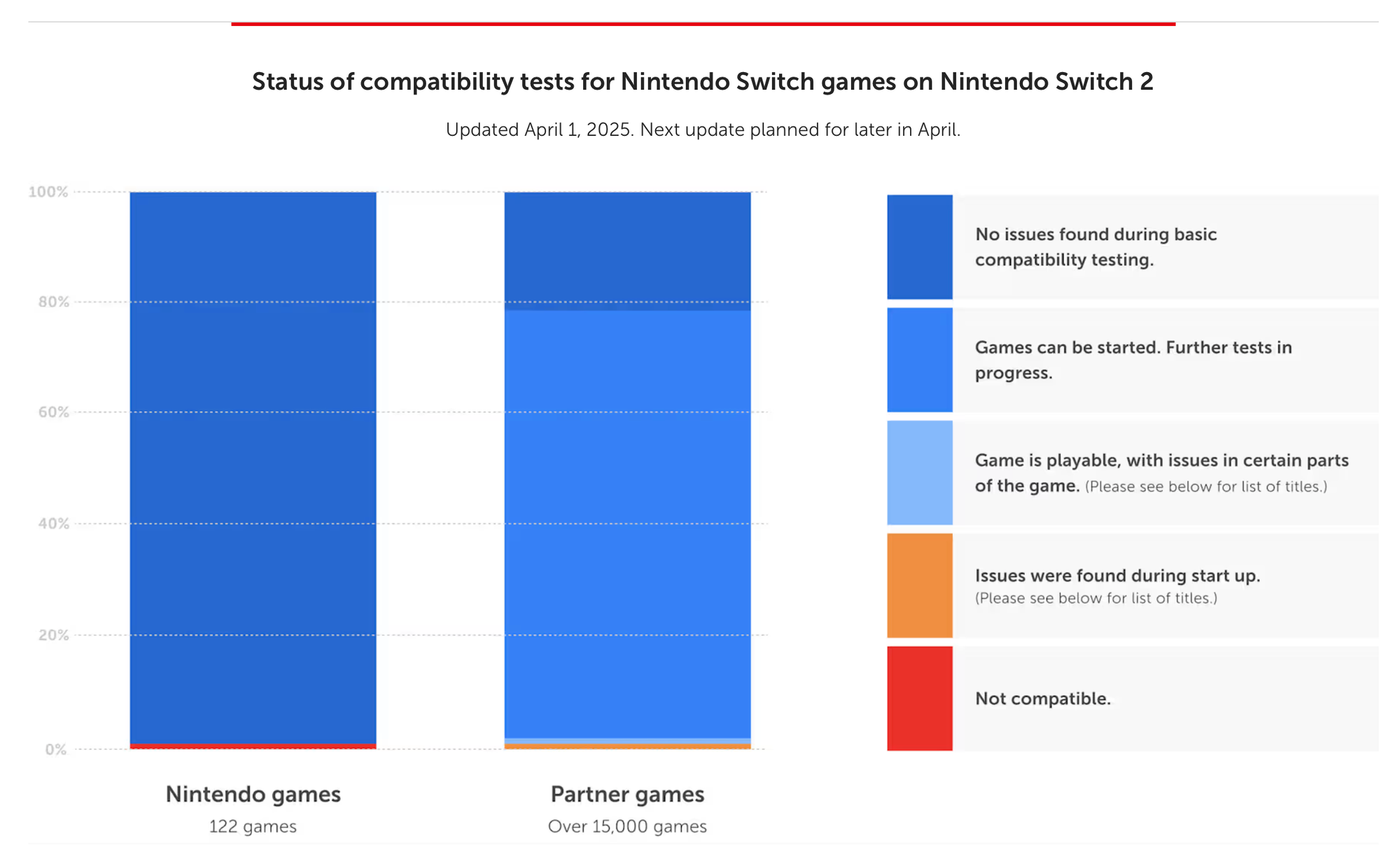Les jeux Switch 1 seront donc compatibles avec la Switch 2 qui, de fait, va démarrer sa carrière avec un catalogue assez incroyable. Nintendo a fait un point très précis sur la compatibilité des jeux Switch 1, avec un graphique et tout. On apprend qu'un tout petit pourcentage des 122 jeux Nintendo ne sont pas compatibles avec la nouvelle console : c'est le cas du kit Toy-Con 04 (le casque VR en carton).