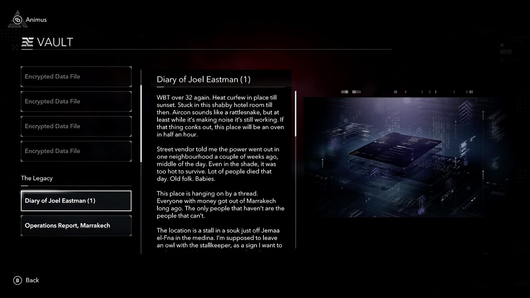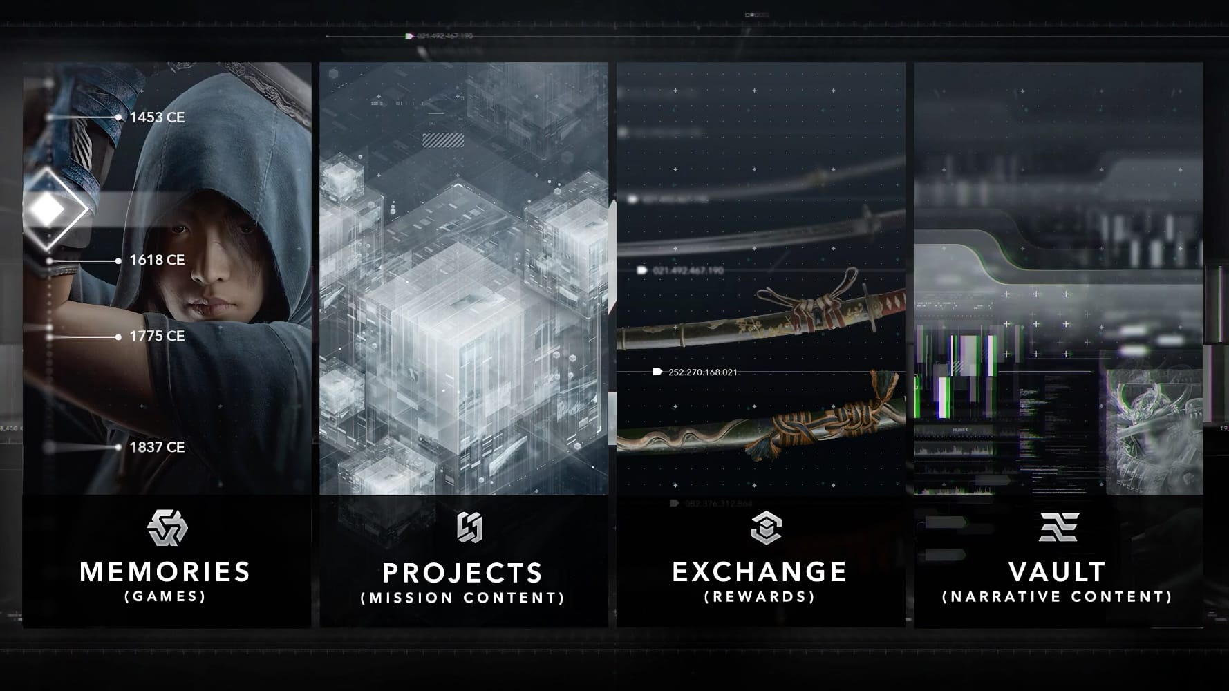 En plus de sa fonction de launcher (mais puisqu'on vous dit que non !), l'Animus Hub comprend quatre sections principales : Mémoires, Projets, Échange et le Coffre. Le premier permet de lancer les jeux — gasp. Le second contient des missions qui apparaissent dans le monde de Shadows, à compléter pour débloquer des récompenses et des clés à échanger contre de l'équipement dans la section Échange. Le dernier permet de déverrouiller des informations sur l'histoire contemporaine d'Assassin's Creed.