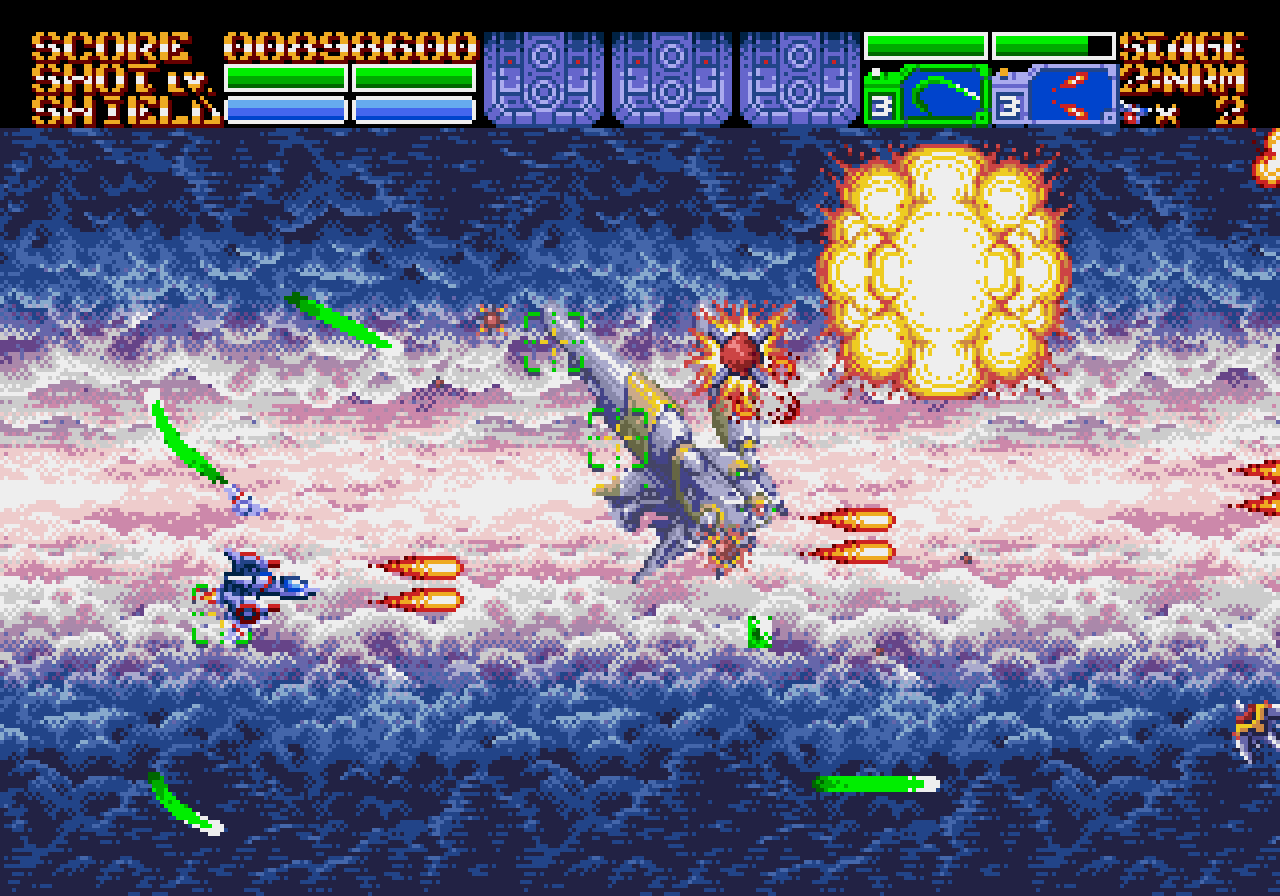 Les premiers niveaux (il y en a 8 en tout, dans des biomes variés) sont assez faciles, mais évidemment les choses se compliquent rapidement. C'est là qu'intervient un mécanisme original : vers la fin des niveaux, un ennemi lâche une capsule spéciale qui permet d'améliorer son vaisseau. Cela peut-être une jauge de bouclier supplémentaire, un slot pour accueillir une arme en plus, des vies bonus, etc. Et si la mort frappe au bout d'un boss, pas de panique : un mot de passe permet de retrouver les différentes améliorations obtenues en cours de jeu.