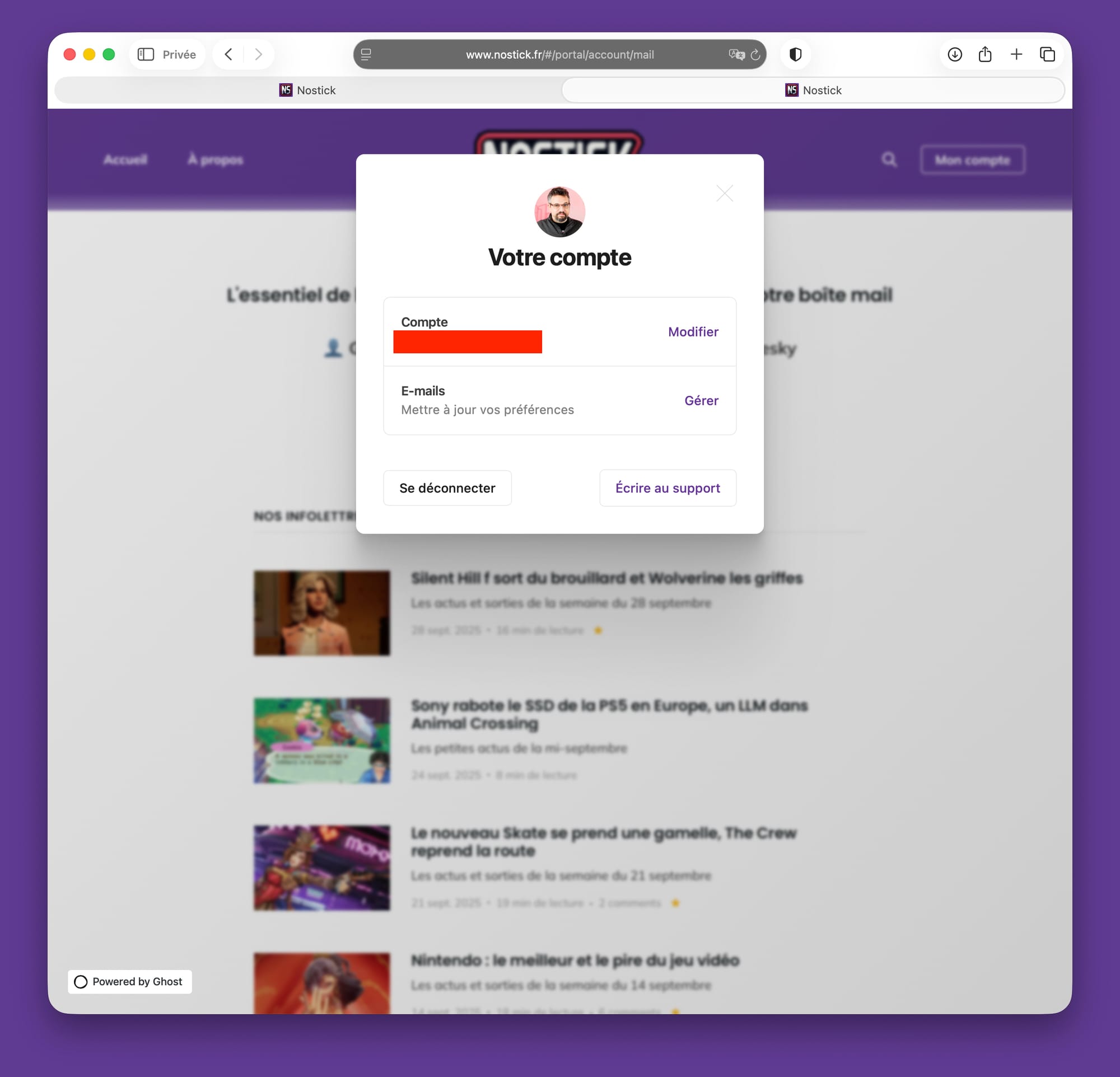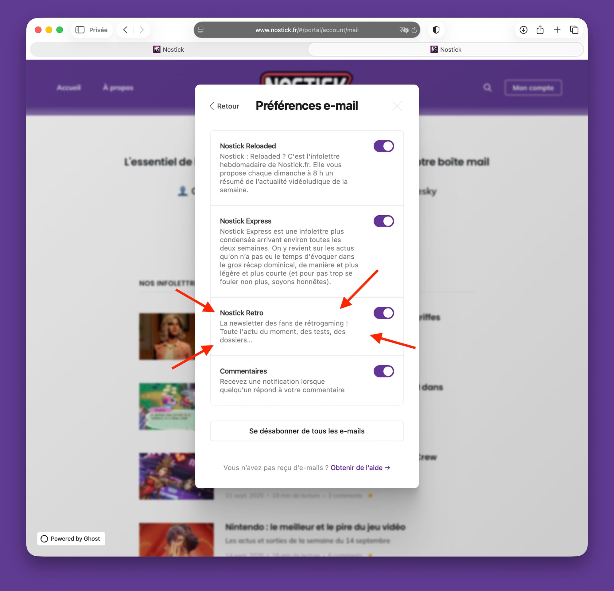 Abonnez-vous pour la recevoir directement dans votre boîte aux lettres ! C'est très imple, il suffit de sélectionner l'option « Mon compte » en haut à droite, puis sur l'option « Gérer » dans la section E-mails. À partir de là, vous pouvez souscrire à toutes nos newsletters : Nostick Retro évidemment, mais évidemment notre hebdomadaire Nostick Reloaded et la quinzomadaire Nostick Express.
