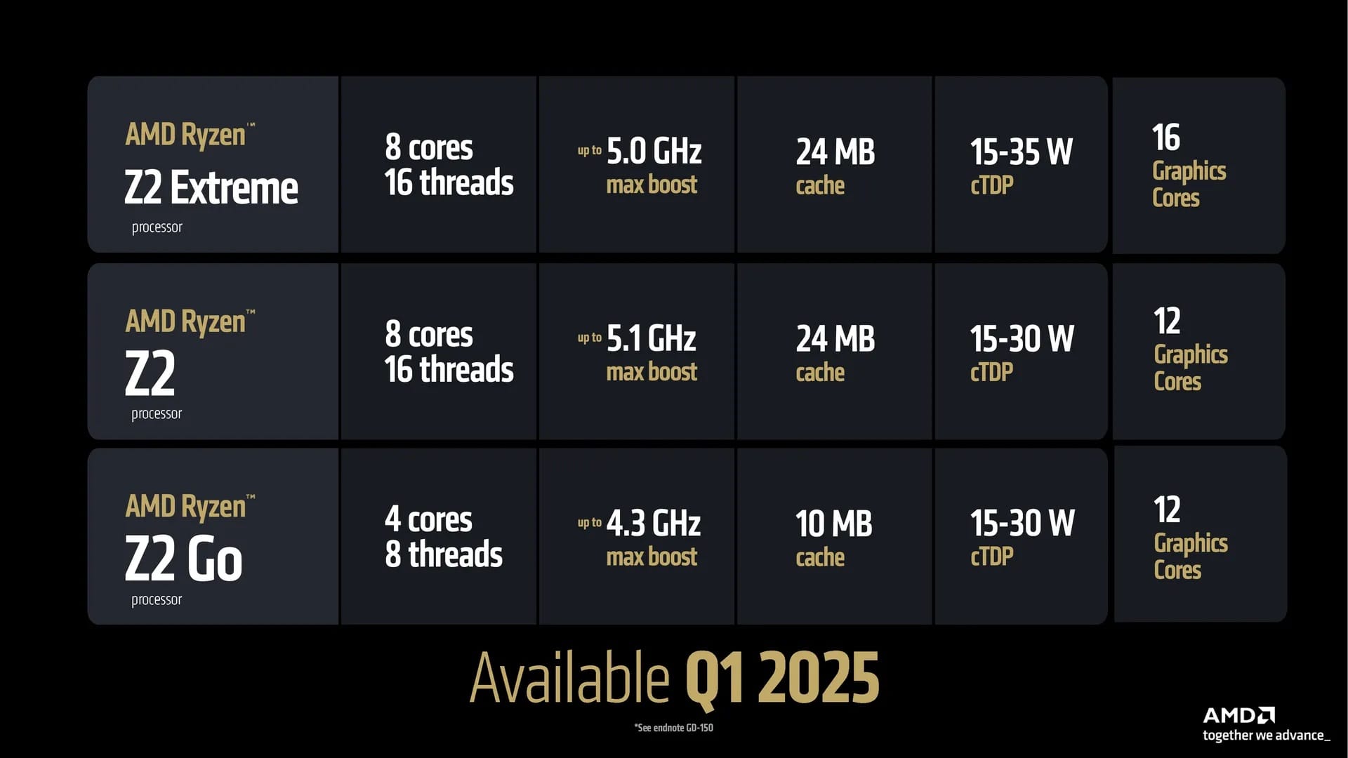Cette puce se destine aux appareils haut de gamme, dont devraient bénéficier les futurs ROG Ally X d'Asus et un des prochains Legion Go de Lenovo. La puce Z2 standard embarque elle aussi 8 cœurs, mais des Zen 4 sous architecture Hawk Point, ainsi qu'un GPU doté de 12 unités de calculs RDNA 3. Celle-là devrait se retrouver sous le capot de consoles d'entrée/milieu de gamme.