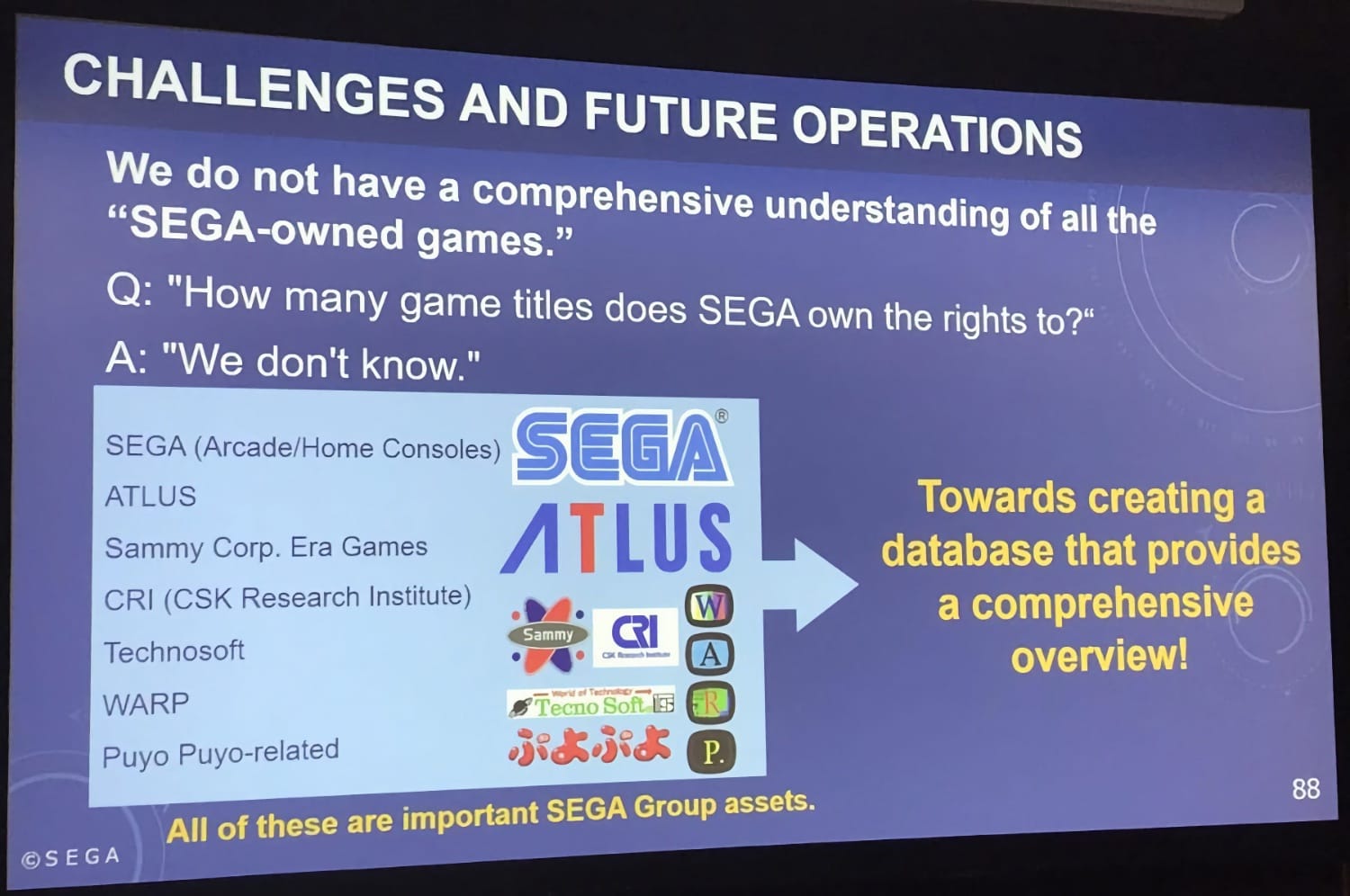 La diapo diffusée à l'occasion de cette rencontre et partagée par VGDensetsu a au moins le mérite de la candeur. Sega est en phase de création d'une « base de données complètes » qui inclura les filiales et les studios affiliés de Sega. Et il y a du beau linge, entre l'historique de Sega en lui-même, et ceux d'Atlus, de Sammy, Technosoft ou encore Warp. Il y a ici pas mal de boulot pour remettre la main sur tout ce bazar.