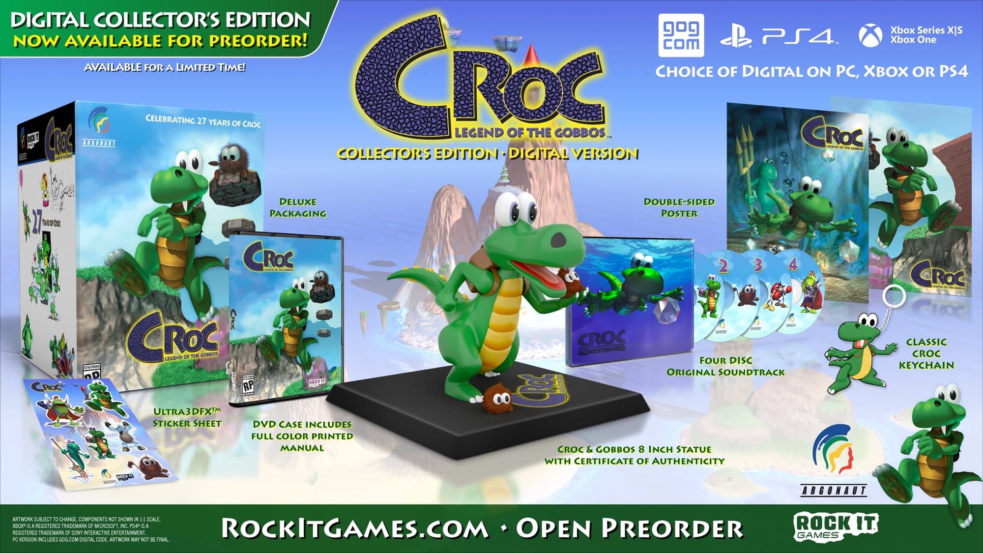 Argonaut Games, qui lance une édition collector de son jeu de plateformes Croc: Legend of the Gobbos — un vieux de la vieille, le titre remonte à 1997 ! —, a prévenu : la version Xbox de cette édition spéciale sera accompagnée d'un code pour télécharger le jeu. Pour le reste, les joueurs recevront le même contenu, notamment le porte-clefs et la superbe statuette à l'effigie du héros. Et bien sûr, le remaster du jeu.